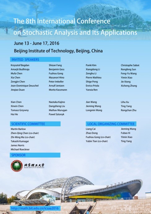 由北京理工大学主办的“第8届随机分析及其应用国际研讨会”将于2016年6月13日至6月 17日在北京理工大学中关村校区举行。本次会议旨在探讨随机分析及相关领域的最新学术动态和前 沿信息,交流最新的研究成果、应用进展。