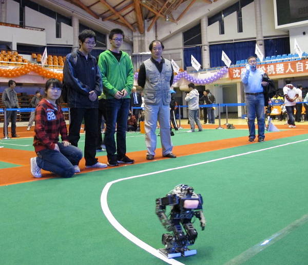 在机器人点球项目中,我校参赛机器人以高超的视觉技术为后盾,眼明脚准,取得了六射四中的好成绩,获得了此项比赛第二名,其极高的精准度得到众多观众的热烈喝彩。