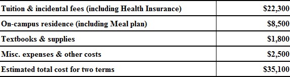 在加拿大滑铁卢大学学习期间的费用由学生自理。每学年(2个学期)的费用估计(加元)如下: