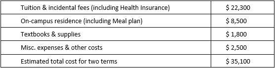 在加拿大滑铁卢大学学习期间的费用由学生自理。每学年(2个学期)的费用估计(加元)如下:
