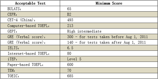 注:表格中列出的CET(China)指的是全国大学英语四级(或六级)考试。我校教务处提供iTEP考试服务,缺少英语成绩的同学如要报名,教务处将统一组织考试。