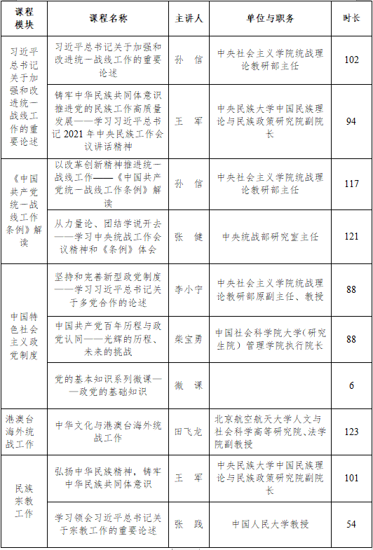 围绕“习近平总书记关于加强和改进统一战线工作的重要论述”“《中国共产党统一战线工作条例》解读”“中国特色社会主义政党制度”“民族宗教工作”“港澳台海外统战工作”等主题设置课程内容。