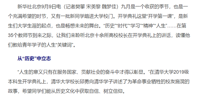 九月是一个收获的季节,也是一个充满希望的时节,又有一批新同学踏进大学校门。开学典礼这堂“开学第一课”,是新生们大学生涯的起点,也是畅想未来的舞台。“历史”“时代”“学习”“精神”“人生”……在第35个教师节到来之际,让我们来聆听北京十余所高校校长在开学典礼上的讲话,读懂他们教给青年学子的人生“关键词”。