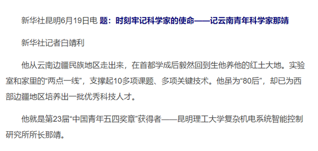 他就是第23届“中国青年五四奖章”获得者——昆明理工大学复杂机电系统智能控制研究所所长那靖。