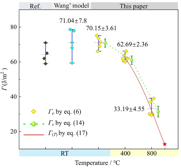 图2 不同温度下热障涂层的界面韧性。红线表示界面韧性随温度变化的预测模型。