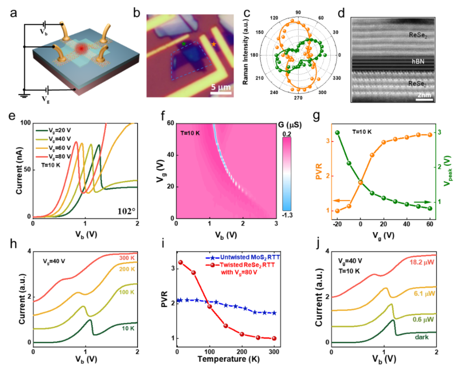 图2展示了102°扭曲堆叠共振隧穿晶体管中的负微分电阻。图a展示了ReSe2/h-BN/ReSe2 共振隧穿晶体管的示意图,其中偏置电压施加在底层ReSe2上,共振隧穿效应发生在重叠区域(红色区域所示)。图b展示了102° 共振隧穿晶体管的光学图像,橙色和绿色五角星表示拉曼测试的位置。两层ReSe2通过几层h-BN(蓝色虚线)分隔。图c展示了在拉曼位移127 cm-1处,顶部(橙色圆圈)和底部(绿色圆圈)ReSe2层的偏振依赖性拉曼强度。拟合线(橙色和绿色线)显示两层ReSe2之间的扭转角度为102°。图d展示了共振隧穿晶体管的TEM横截面图,显示两层ReSe2的相对晶格方向。图e展示了在不同栅电压下的隧穿电流与偏置电压的关系,清楚地展示了栅电压依赖的负微分电阻。图f展示了共振隧穿晶体管的电导图,显示了负微分电阻峰值随栅电压的变化趋势。图g展示了PVR和负微分电阻峰值位置随栅电压的变化总结。图h展示了栅电压Vg=40 V时不同温度下的隧穿电流与偏置电压的关系,显示出负微分电阻对温度敏感。图i展示了102°TS-RTT与基于单层MoS2的未扭曲共振隧穿晶体管之间的温度依赖PVR比较,未扭曲共振隧穿晶体管对温度几乎不具有依赖性。图j展示了在不同激光功率的520 nm光照射下的隧穿电流与偏置电压的关系,显示出负微分电阻对光照敏感。