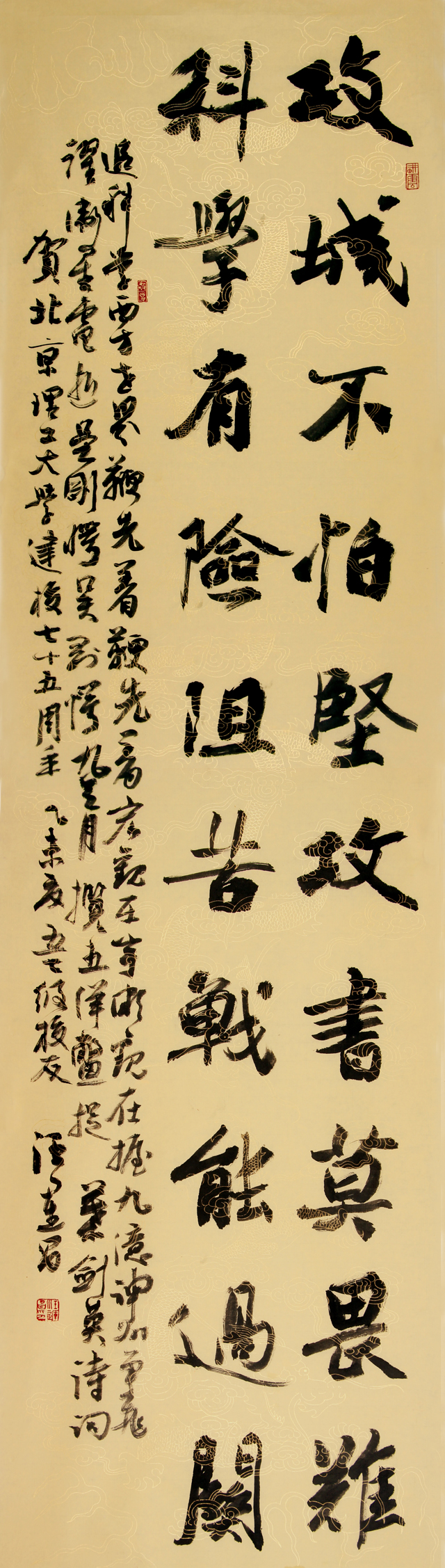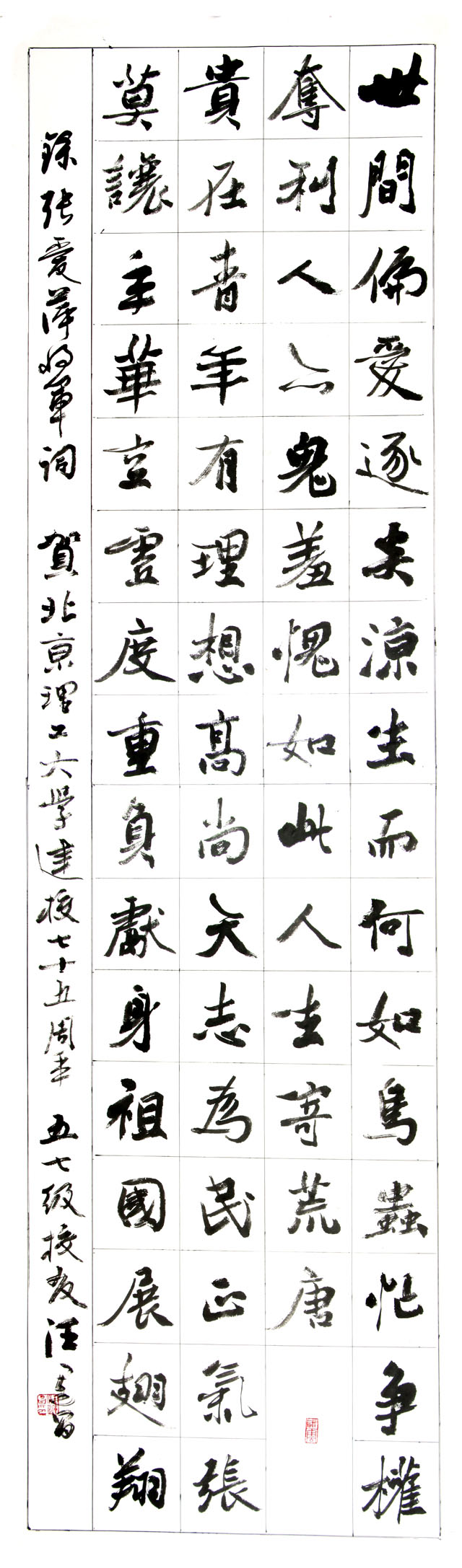 汪运昌先生,号赏古斋,中国书法家协会会员,1962年从北京理工大学毕业后,从事军事科研工作,同时酷爱书法艺术。回忆起大学时代,汪老先生感叹道,那时候条件艰苦,从河北的一个普通农村家庭考到北京理工大学,是当地新中国第一代大学生,完全靠着国家提供的助学金,读完五年大学,没有再向家里要过钱。汪老先生在校学习勤奋,善于动脑,学习成绩非常优秀。讲述业余时间文艺活动时,汪老先生脸上扬起了灿烂的笑容,当时他参加了学校的民乐队,当时北理工民乐队表演水平非常高,在北京高校中数一数二。他兴奋而又谦逊地说他在里面也就是“滥竽充数”。正是在母校丰富的业余文艺氛围熏陶下,汪老先生的艺术素养得到提升,也为以后从事书法艺术创作奠定基础。